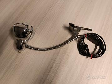 Lampada vintage da lettura, braccio flessibile con graffa a molla per fissaggio. Realizzata interamente in robusto metallo cromato integro. Altezza cm. 35, diametro cm. 10. Condizioni ottime, funzionante, con lampadina. Preferibile consegna a mano Milano città.