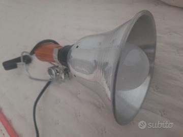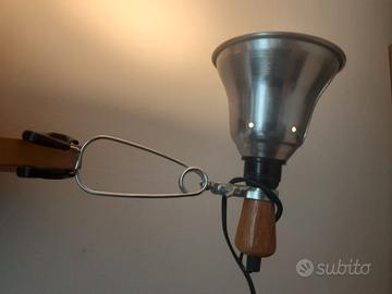 Lampada in legna e metallo snodata con molla da agganciare a un ripiano. Lunga 30 cm.