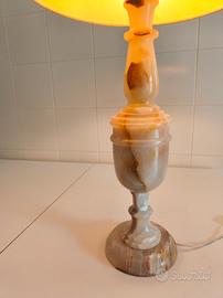 Lampada da tavolo vintage in onice/alabastro naturale. Altezza 75 cm, paralume in tessuto beige con bordo rifinito.