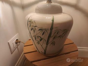 Lampada da tavolo vintage dal forte carattere decorativo, caratterizzata da una raffinata base in porcellana smaltata con motivi orientali raffiguranti bambù, simbolo di eleganza e armonia.