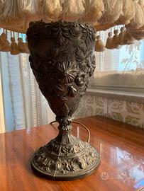 Abat-jour antica con base in ferro, finemente decorata e paralume ricamato