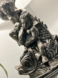 Base: La base della lampada è in stile scultoreo, in metallo con finitura patinata e argentata. Raffigura due cherubini (putti) che cavalcano una creatura marina simile a un delfino. I dettagli sono intricati, con dei dettagli molto realistici mostrando dei cherubini e le squame della creatura sembrano dí essere scolpite simile a una statua.