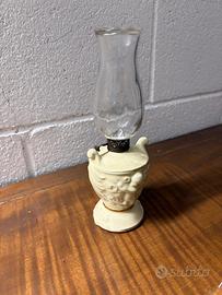 Lampada a petrolio vintage con base in ceramica smaltata color avorio/giallo chiaro, decorata a rilievo. Camino in vetro trasparente con bordo ondulato, supporto in metallo traforato.