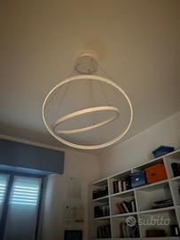 Lampada a sospensione LED di design moderno, anello luminoso con barra a LED incrociata, luce bianca, cavi regolabili. Design contemporaneo, ideale per soggiorno, sala da pranzo o studio. Perfettamente funzionante, venduta per cambio arredamento.
