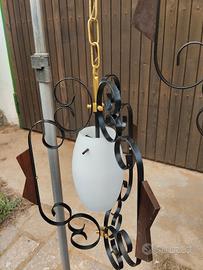 gruppo di lampadari anni '60 con struttura in ferro, inserti in legno e vetri opaline così composto: 1 lampadario da soffitto con struttura a 3 bracci e 1 luce; 1 lampadario da soffito con struttura a 2 bracci e 1 luce; 2 applique a 1 luce.