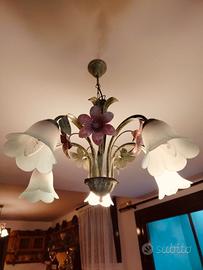 2 Lampadari a sospensione con fiori in metallo, per interni con paralume in vetro floreale (un lampadario a 3 teste ed un altro 4 teste). Un paralume è rotto.