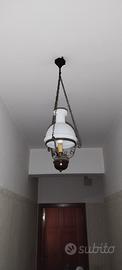 Coppia di lampadari a sospensione con paralume a campana in vetro opalino bianco e struttura in ottone con dettagli in legno.
