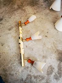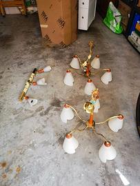 Vendesi due lampadari a 5 luci ed una striscia a 3 luci color ciliegio ed oro con lampada a forma di cono/fiore.