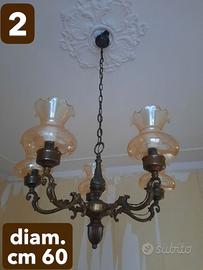 2. Elegante lampadario d’epoca a 5 bracci in ottone brunito con paralumi in vetro soffiato ambrato. In buone condizioni, funzionante. Diametro 60 cm, altezza regolabile con catena. Prezzo 35 €