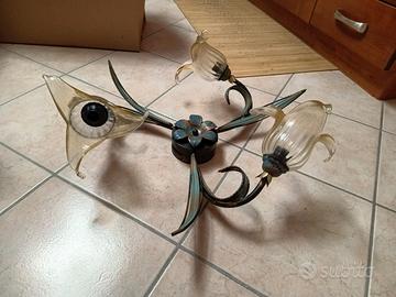 Plafoniera + Applique coordinata. Splendido set di lampade in stile Liberty/Fiorentino, realizzate in metallo lavorato a mano con sfumature verdi, rame ed oro, arricchite da elementi a forma di foglia e fiore centrale. Paralumi in vetro ambrato a forma di bocciolo di tulipano