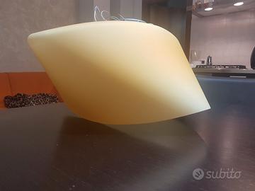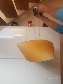 Vendesi COPPIA di lampadari a sospensione Foscarini Cross del 1998 in vetro di Murano del designer Valerio Bottin per Foscarini. Colore esterno arancio acidato e bianco all'interno. Misure singolo lampadario cm 50x22x50.