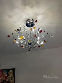 Vendo 2 lampadario a sospensione moderno con struttura in metallo cromato e decorazioni floreali in vetro e cristallo colorato.