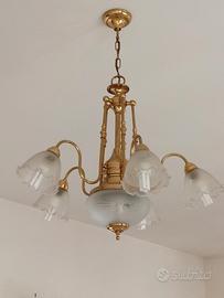 Coppia di lampadari a cinque bracci con coppe in cristallo smerlate finemente lavorate e struttura con bagno in oro. Altezza totale cm 70. In perfetto stato. Vendesi anche separatamente. Coppia Euro 130 = Singolo Euro 70