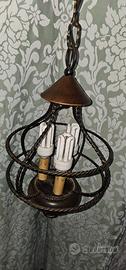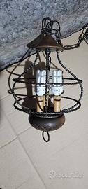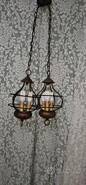 N° 2 Lampadari vintage in ferro battuto e legno, usati, a forma di lanterna, con tre porta lampada a forma di candele, particolare in legno lavorato, sicuramente d'effetto con lampade adatte in un ambiente rustico. Misure: - Da anello superiore a anello inferiore cm 43 circa - Da cono legno a base legno inferiore cm 33 circa - Circonferenza anello in ferro nel punto più largo cm 26 Spedizione e pagamento con Tutto Subito