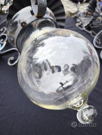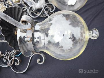 Set di 4 splendidi lampadari artigianali vintage a sospensione in ferro e vetro per: androni, ingressi, porticati, taverne, casali, cascine, luoghi rustici o antichi. Sono composti da una struttura a gabbia apribile in ferro battuto (con tre eleganti volute e riccioli), che sorregge un'ampolla a goccia in vetro sagomata e con base a pomolo, da un cappello plissé copri-ampolla comprensivo di portalampade E27 e da una catena in ferro ad anelli ritorti che porta alla conchiglia plissé a soffitto Il ferro si presenta solido, verniciato di nero, in alcuni punti ha una leggera ossidazione. I vetri sono integri, con alcune righe superficiali in corrispondenza con la gabbia ma perfettamente trasparenti. I lampadari sono completi. dimensione di ciascuno dei 3 lampadari più piccoli: altezza complessiva (vetro e ferro) 45 cm circa, lunghezza catena 50 cm (accorciabile a piacere), altezza struttura in ferro 30 cm circa, diametro della struttura in ferro (ingombro) 22 cm circa, diametro ampolla 14 cm circa dimensione di 1 lampadario grande: altezza complessiva (vetro e ferro) 52 cm circa, lunghezza catena 50 cm (accorciabile a piacere), altezza struttura in ferro 33 cm circa, diametro della struttura in ferro (ingombro) 25 cm circa, diametro ampolla 18 cm circa peso del singolo lampadario piccolo 2 kg circa peso del lampadario grande 3 kg circa Si vende tutto il lotto coordinato ad un prezzo di affare Dimensione stimata per l'imballo 60 x 40 x 50, peso stimato con imballo 15 kg. In alternativa alla spedizione, posso consegnare ad Arezzo. Posso fornire ulteriori fotografie.
