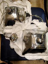 N. 1 lampadario in vetro Colore acciaio con interno smaltato bianco. La base quadrata misura cm 25 per 25 Lo sviluppo verticale è di cm 75.