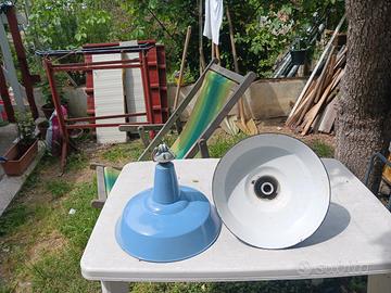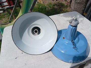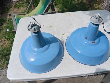 coppia di lampadari vintage,smaltati ,stile industriale. colore esterno lilla, viola chiaro colore interno bianco buone condizioni generali con segni dell'età