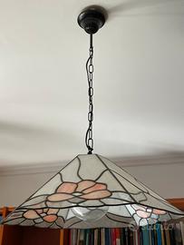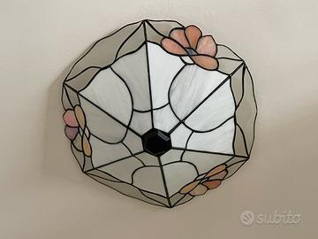 Eleganza senza tempo per la tua casa: 1 lampadario, 2 plafoniere e 2 applique coordinati in perfetto stile Tiffany, realizzati in vetro colorato saldato a stagno.