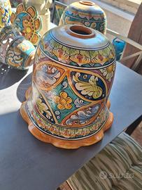 3 bellissime lampade a campana , 1 applique con doppio braccio e doppia campana più piccole, 1 lampadario acquistate a Caltagirone da maestri artigiani. Artigianali dipinte a mano. si vendono in blocco o singolarmente. altra oggettistica stesso stile disponibile.