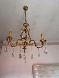 Il set comprende un grande lampadario in ottone massiccio, di grande effetto scenico, impreziosito da eleganti gocce e catene in cristallo vero e pesante.