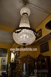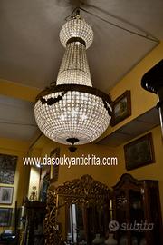 Imponente lampadario stile Impero a mongolfiera a 10 luci, realizzato in bronzo cesellato con spettacolari cascate di vetro sfaccettato e telaio ricoperto di fili di perline.