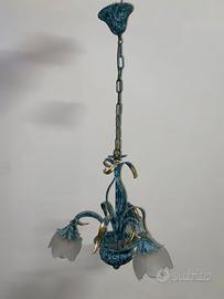 Vendo elegante lampadario a 3 luci marca Flamina modello 9100/3, in ferro battuto decorato con finitura verde patinata e vetri satinati a forma di fiore.
