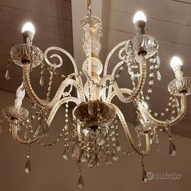 lampadario 6 bracci vetro , gocce e perle di cristallo, anni '90, smontabile, intatto