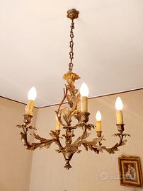 Elegante lampadario in bronzo dorato lavorato con motivi fogliati, completo di 6 punti luce con portalampada a candela. Pezzo di pregio, ideale per arredare con stile ambienti classici o d’epoca. Materiale: bronzo dorato Luci: 6 Dimensioni: larghezza circa 65 cm, altezza (escluso il filo) circa 53 cm Condizioni: ottime, pronto per essere installato Perfetto per salotti, sale da pranzo, ingressi o ambienti raffinati. 💡 Disponibile per visione e ritiro.