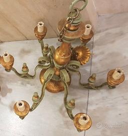 Lampadario 6 luci artigianale in ferro e legno con finitura color oro, perfetto funzionante di ottimo pregio e resistenza da collezione.