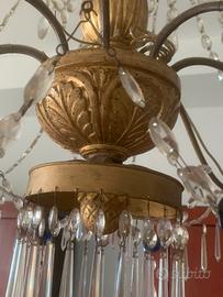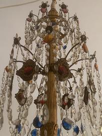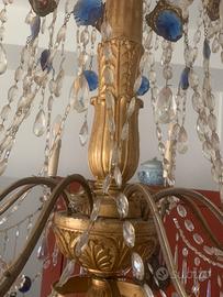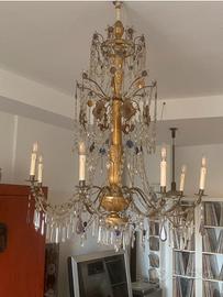 In ottime condizioni con impianto di illuminazione funzionante fusto in legno dimensioni h 140 e larghezza 100 Lampadario"Genovese" del XVIII secolo (o in stile), caratterizzato dal fusto centrale in legno o metallo dorato, bracci in ferro battuto e una ricca decorazione di cristalli trasparenti e colorati. Cristalli Colorati: La presenza di gocce blu (cobalto/zaffiro) e rosseè un elemento tipico e molto apprezzato nei lampadari genovesi. M Fusto e Bracci: Il fusto centrale ha una buona doratura. I bracci "a ricciolo" in ferro dorato con innesti a rosetta sono coerenti con lo stile del tardo '700. PREZZO DI PERIZIA dinensioni monumentali 120cm), cristalli rari iffiro/rubino), fusto intagliato. € 10.000 - €25.000