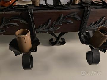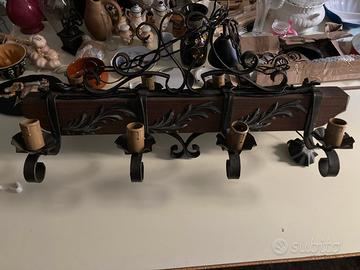 Lampadario 8 luci in legno e ferro decorazione, presenta delle rametti con foglie in ferro, misure del lampadario: Lungo cm 85 Alto cm45