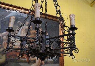 Maestoso lampadario vintage degli anni 60 stile Gotico in ferro battuto con finitura nera con elementi ricurvi, volute, dettagli floreali e fogliacei, sospeso tramite catene in ferro, che si collegano a sei “braccia a torchon che si estendono dal fusto centrale del lampadario dove troviamo