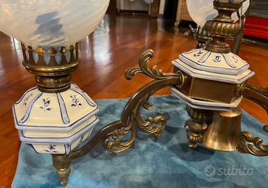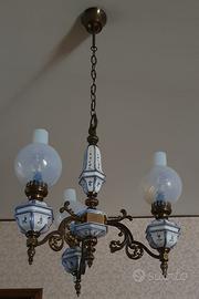 Struttura in metallo , 5 parti in ceramica bianca e blu dipinta a mano