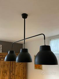 Lampadario a sospensione con tre paralumi, in metallo nero opaco, caratterizzato da un design minimal e industriale, perfetto per illuminare tavoli da pranzo, piani di lavoro o ambienti living.