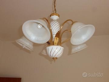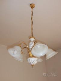 Vendo lampadario dorato e paralumi in vetro a 5 luci .Ritiro a carico del compratore.