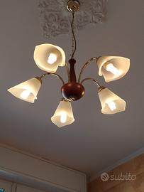 Lampadario a 5 luci, in legno color ciliegio con bracci in metallo finitura oro. Le coppe sono in vetro a forma di calla. Molto bello, elegante, raffinato. Tenuto molto bene, ottimo per sale o camere da letto con mobili ancora in legno di un certo pregio. Funziona Ritiro a mano zona Genova Rivarolo piano strada, ottimo per carico in auto.