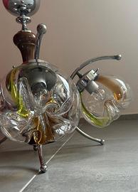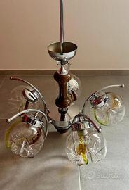 Splendido lampadario a 5 luci in stile Space Age, pezzo iconico di modernariato italiano. Caratterizzato da una struttura in cromo e legno tornito che sorregge 5 globi in vetro artistico lavorato a mano.
