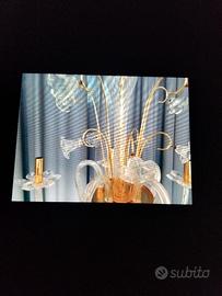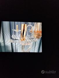 lampadario a 5 luci in vetro con rosette in vetro e bobeches su bracci con cristallo al piombo con montatura dorata d.65cm h.58cm