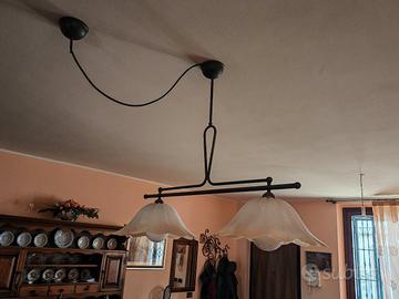 Perfetto, completo di tutto e perfettamente funzionante. Bilanciere colore "marrone brunito" e vetro lavorato a mano (non stampato). 2 lampade attacco E27. (grande). Doppio rosone per collegamento decentrato. Dimensioni: Altezza da soffitto a filo campana 85cm. Altezza stelo 30cm Larghezza lampadario ingombro 106cm Larghezza bilanciere 90cm Diametro campane 40cm Altezza campane 19cm NON SPEDISCO solamente perché lo ritengo troppo rischioso.