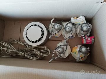 Lampadario a binario da soffitto con 5 faretti. Facile da montare completo di tutto, trasformatore e cavi in ottime condizioni, usato pochissimo. Una volta fissati i cavetti si decide a piacimento la collocazione dei faretti. Ottimo anche per uffici negozi o attività commerciali. Nell'ultima foto si vede il lampadario installato sul soffitto, lunghezza circa 5 metri.