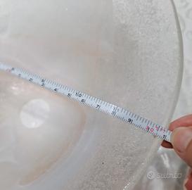 Lampadario a campana in vetro di Murano trasparente con venature bianche e salmone, presenta una piccolissima crepa assolutamente invisibile perché verrà coperta dalla coppa che lo sostiene, inoltre si confonde con le venature stesse del disegno decorativo, io stessa non l'avevo mai notata in tanti anni che è stato appeso, per amore di correttezza lo specifico, ed il prezzo riflette infatti questa condizione.