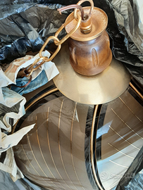 Lampadario a cupola, struttura in ferro, foglie in vetro satinato, funzionante. Diametro massimo 40 cm, altezza 25 cm esclusa la parte in legno.