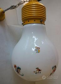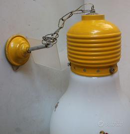 Particolare e raro lampadario forma di grande lampadina, originale anni '70, con la boule lattea ed attacco arancione, con filo regolabile in altezza (ancora originale). Modello stra-imitato con prodotti di bassa qualità; questo è quello originale degli anni’70. Lo stato di conservazione vintage è ottimo. Altezza senza catena cm. 47,00 - diametro cm. 31,00- altezza con catena minimo cm. 77,00. Occasionissima.