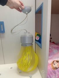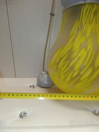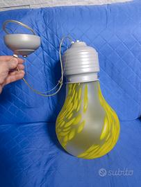 Vendo bellissimo lampadario a forma di lampadina anni 2000 con boccia in vetro a fantasia gialla e corpo porta boccia e supporto al tetto in metallo colore grigio chiaro, il tutto con sospensione a cavetto in acciaio regolabile in altezza, completo di lampadina al suo interno, funzionante al 100%.