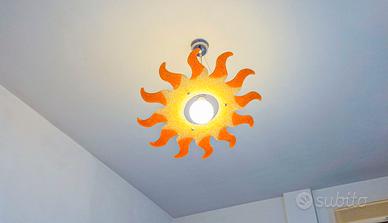 Lampadario in resina a forma di sole per cameretta bambini, completa di potente lampada a led. Mediante 3 cavi può essere montato con una angolazione a piacere. Diametro 35cm