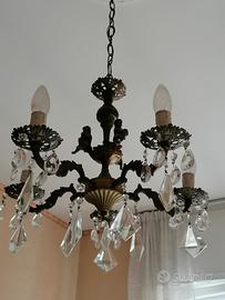 Lampadario vintage a sospensione a 5 bracci con gocce di cristallo e due angeli in ottone. Perfettamente funzionante e integro.