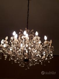 Lampadario a gocce di cristallo con catenella, a due giri "braccia", il primo ha 14 luci, il secondo 7, diametro 83-84, i costi x lo smontaggio a carico dell'aquirente