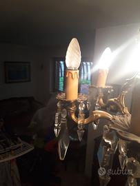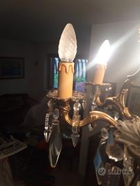 vendo lampadario con cristalli a goccia,struttura in ottone in ottime condizioni,funzionante,e 2 applique in ottone stesso stile con pendenti uguali al lampadario.