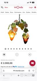Fantastico lampadario degli anni 1970 circa, tutto originale della ditta Cesare Toso. Il lampadario è composto da una struttura in ferro portante, dai grappoli di uva e dalle foglie che sono in vetro di Murano. Ogni vetro è diverso dall'altro, è un opera d'arte. Naturalmente c'è qualche segno del tempo ma i vetri non sono rotti né crepati.