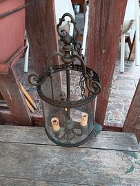 Vendo lampadario a lanterna vintage.Struttura realizzata in ottone,con un cilindro centrale in vetro soffiato,o curvato a caldo.Il cuore della lanterna ospita tre punti luce,con portalampada a forma di candela.